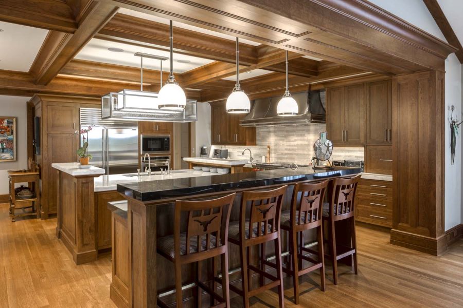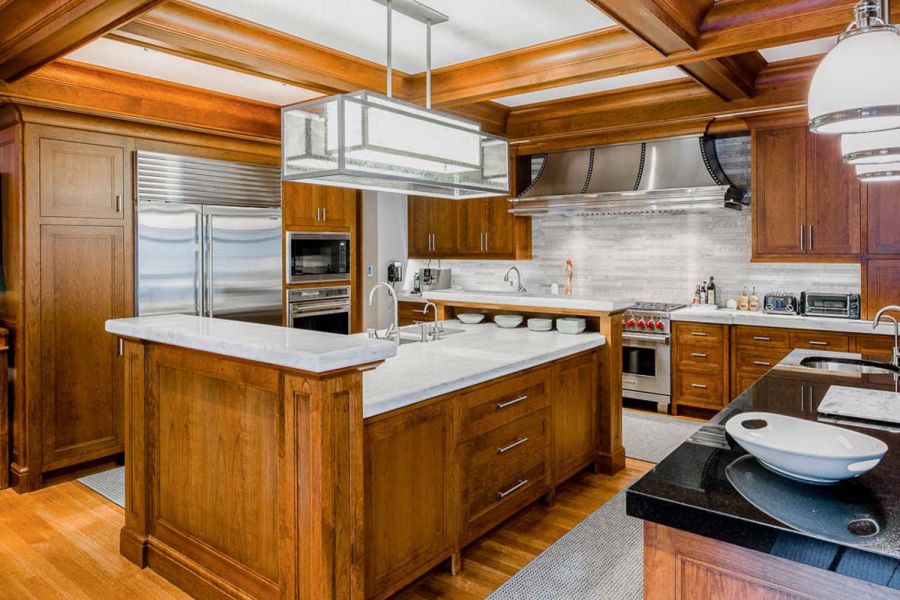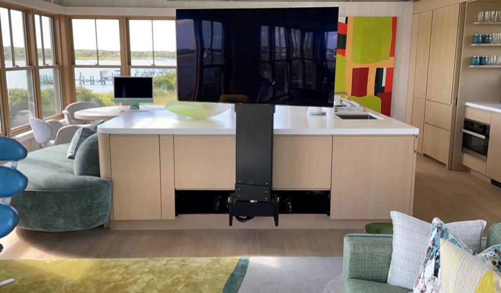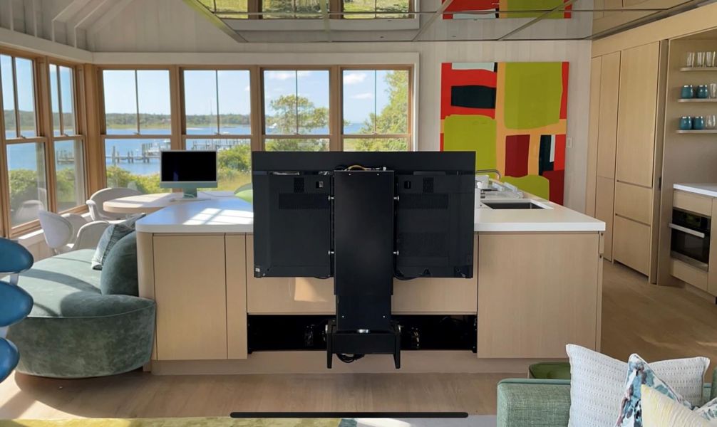 A highlighted feature is the custom engineered motorized lift housing a 60” TV built within the kitchen island. At the touch of a button, the TV magically appears from beneath the island and then rotates 180 degrees within the room for viewing from several vantage points and then disappears below the island when not in use.