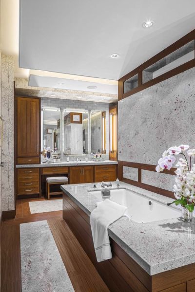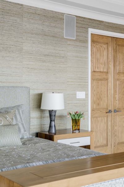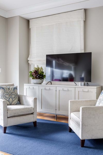 The JBL Synthesis system (processor, amps, speakers, etc.) brings cinema-quality surround sound into this oceanfront home. With a Dolby Atmos configuration, the setup offers unparalleled options to create presets and adjust volume, balance, and more. Fiberglass panels are hidden behind decorative wall fabric to enhance acoustics while minimizing sound transfer to adjacent rooms.