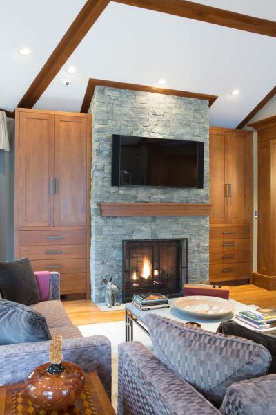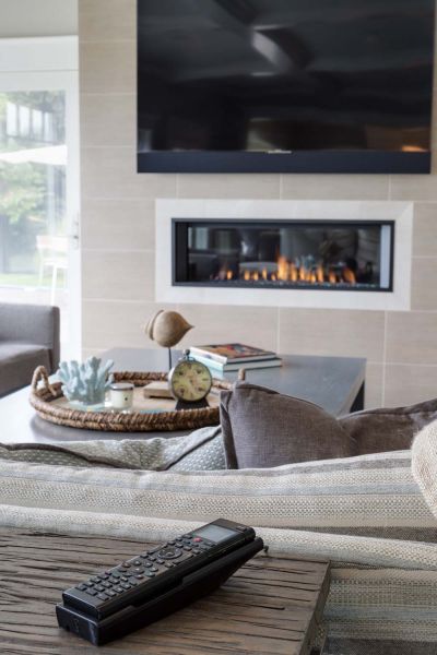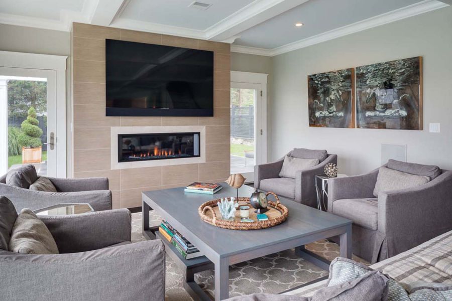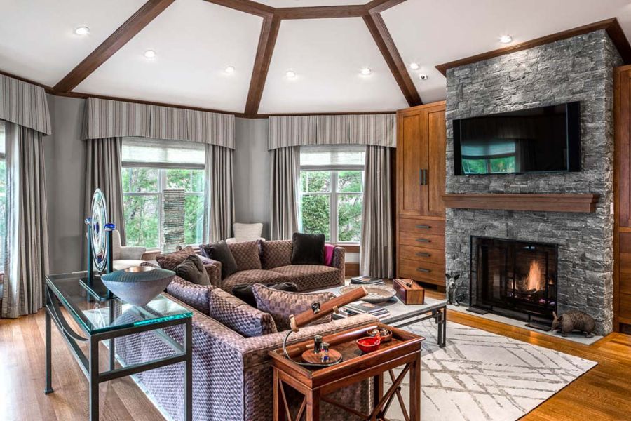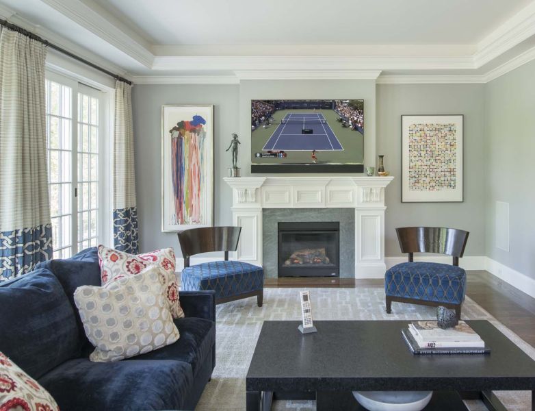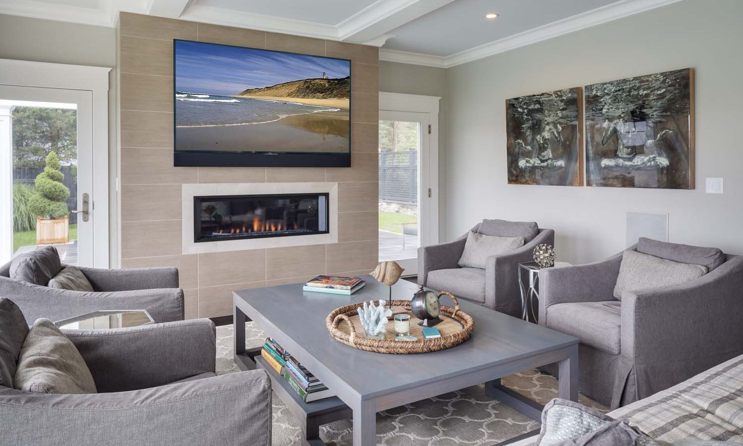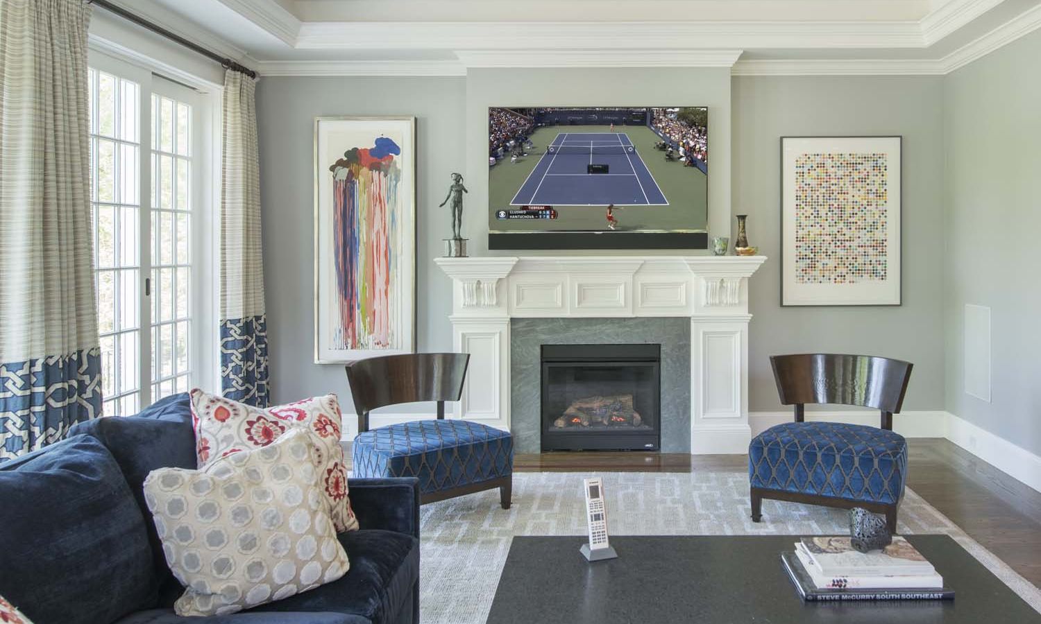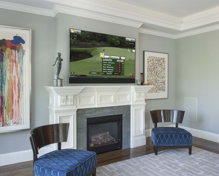 The fireplace wall in the family room is perfectly accented by a 75” Sony 4K TV, paired with a custom Leon LCR soundbar that’s designed to blend flawlessly with the size and finish of the entertainment system. A Totem Acoustic subwoofer is similarly camouflaged, thanks to in-wall installation. TV, streaming music, and lighting for this communal space are controlled with a handheld remote linked to the Control4 whole-house system.