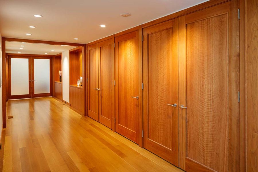 Electric shades throughout the house are programmed for privacy and light control. Interior lights are integrated with the Savant home control system for easy adjustment through in-home keypads or personal mobile devices like smartphones and tablets. In the study, a custom-lit display cabinet is a standout addition, with programmed presets based on time of day and whether display spaces are open or closed.