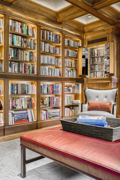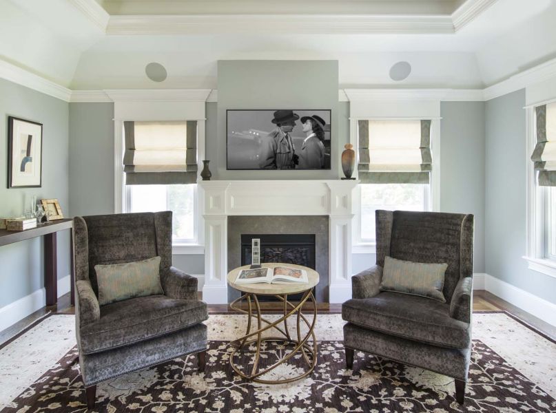 Any room can house a flatscreen and surround sound speakers, but a home theater requires more. The details include a custom, old-fashioned theater door and extensive millwork on columns, and soffits, which provide an old Hollywood ambiance. Also, the surround sound speakers and Acoustic Innovations acoustic panels are worked seamlessly into the design.