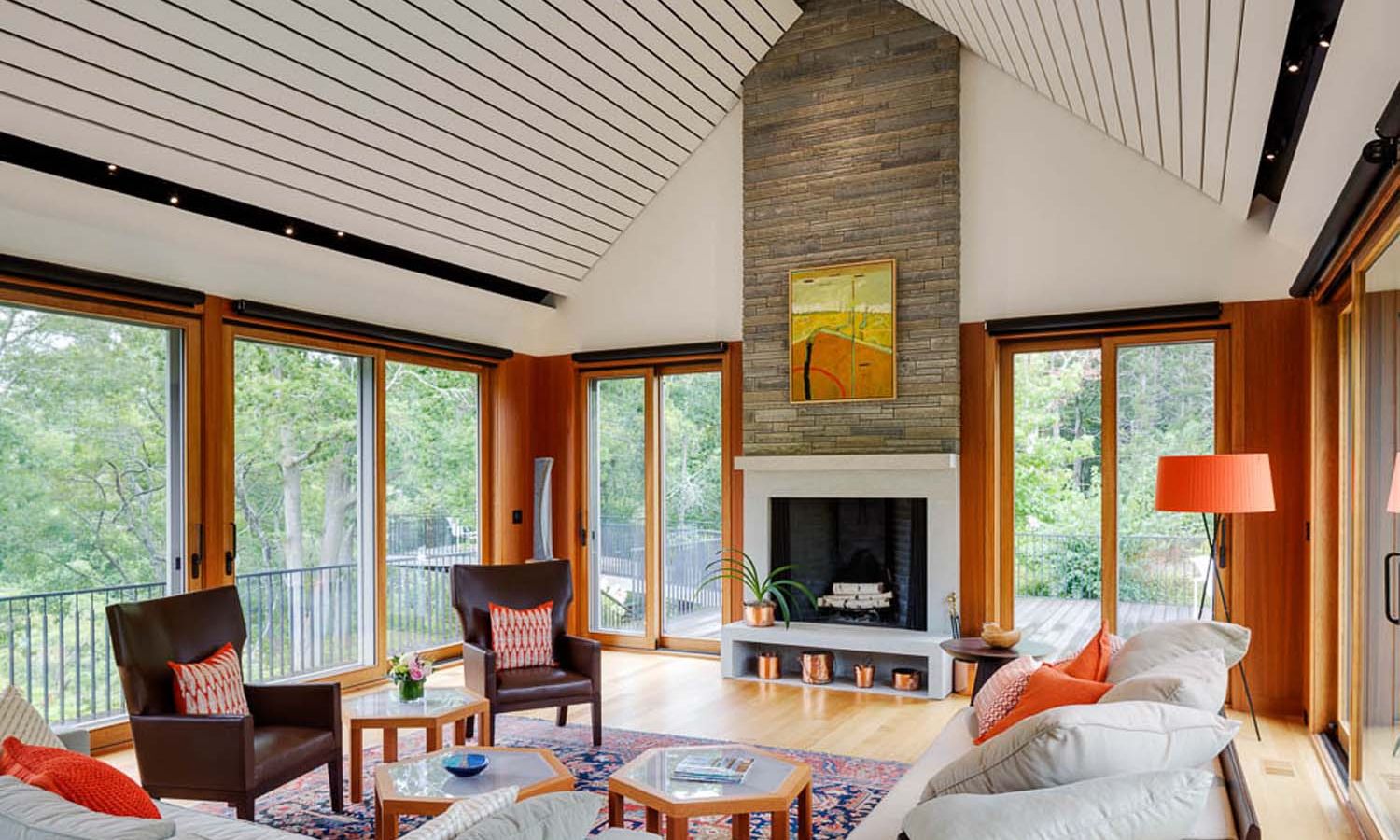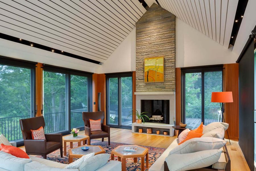 Streaming music services including Pandora, Spotify, Sirius, XM, and Tidal create endless choices of music.Primary entertaining areas (open space containing the kitchen, dining and living rooms) have built-in Sonance Invisible Series speakers. Nothing shows! Secondary interior areas use visible but stylish Sonance Architectural Series in-ceiling speakers that match and fit nicely within the rooms’ existing cabinetry. Super high quality James outdoor loudspeakers are used on the rear deck, sunroom, and side patio.