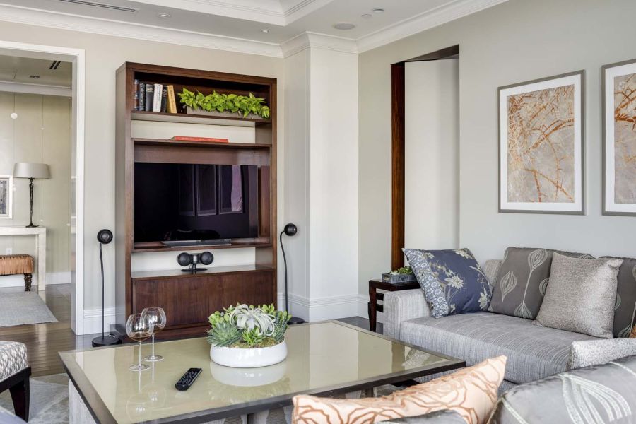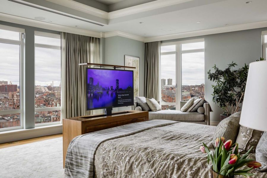 Entertainment amenities include a custom piece of furniture at the foot of the bed in the primary bedroom that houses a 43” Samsung flatscreen on a quiet lift mechanism paired with surround sound. Convenient controls are placed on either side of the bed, and remote operation is possible via iPhone or Android app.
