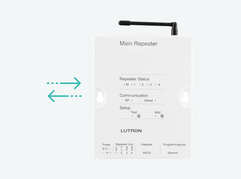 Easily integrate motorized window treatments with Lutron lighting solutions and many other third-party devices. Using a main repeater, which expands wireless control beyond a 30-foot radius, you can create perfect light every time by adjusting shading and lighting systems together.